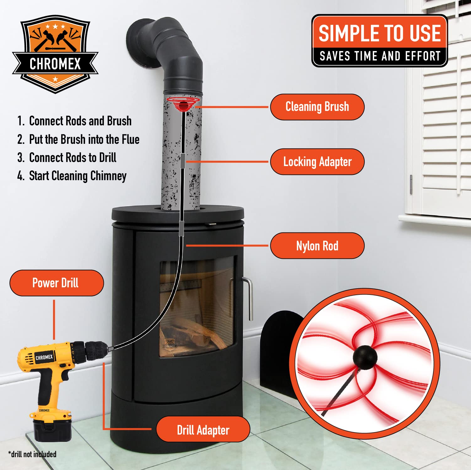 Amazon Com Chromex Drill Rotary Chimney Cleaning Brush And Rod Kit 10 Piece Rod Set Extends Up To 30 Feet Includes Spinning Whip Brush And Protective Plastic Sheets Drill Not Included